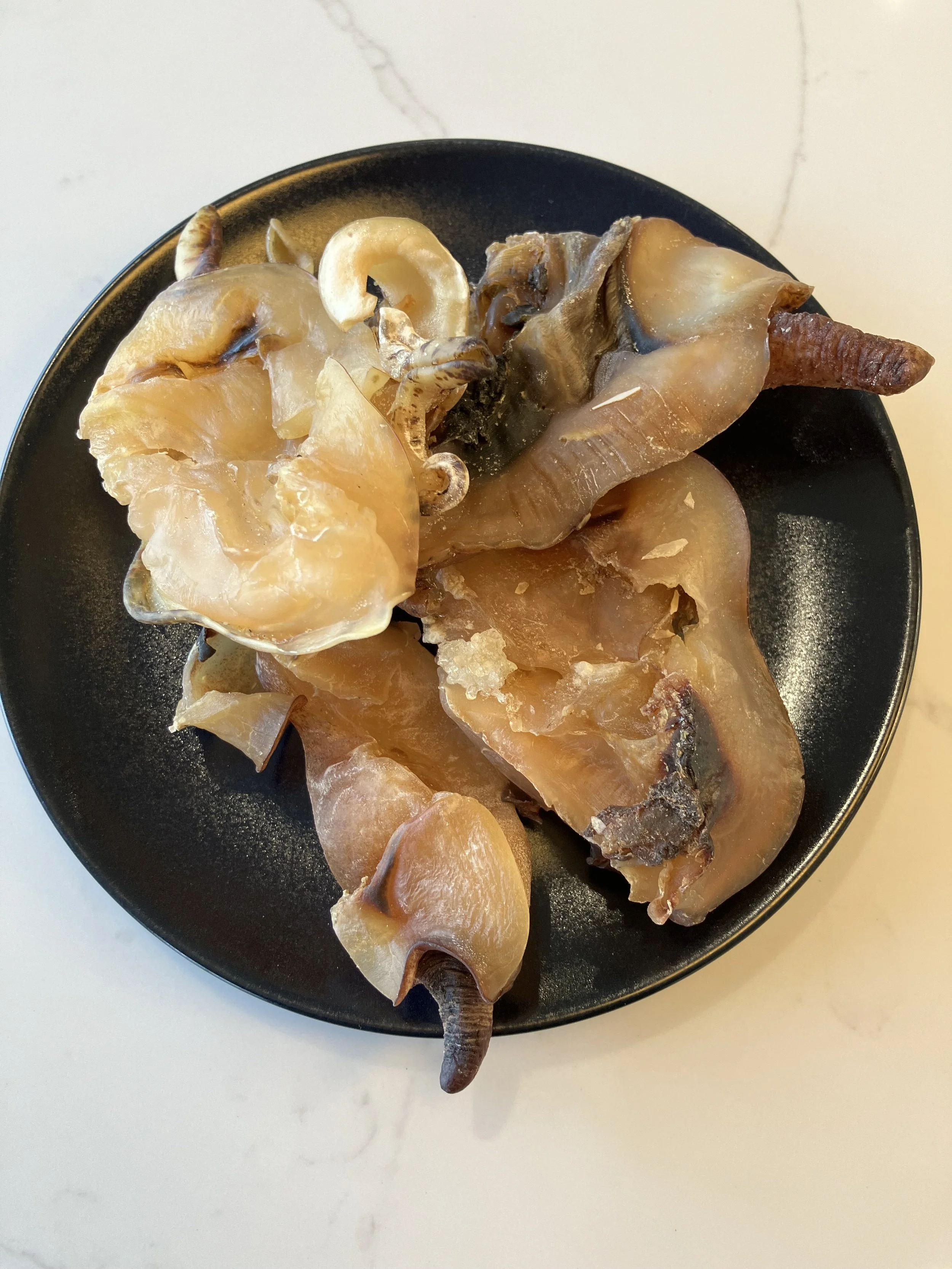 處理:用清水浸約半天 8-12小時,或加入熱水浸約10分鐘,至軟身,洗淨及清除沙粒,便可烹調